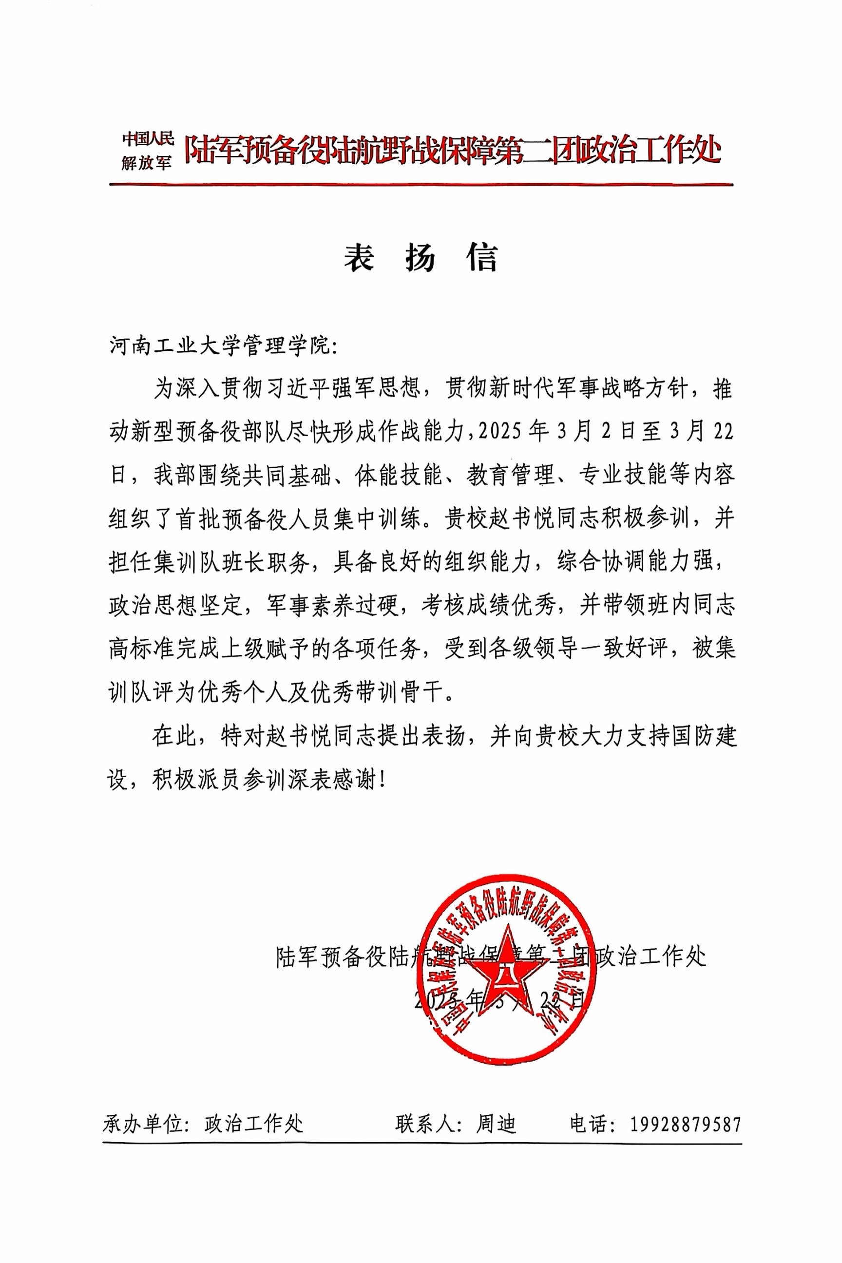 收到来自陆军预备役路航野战保障第二团政治工作处的表扬信,对电子商务专业2022级学生赵书悦在3月2日至22日预备役人员集中训练中表现出的“政治思想坚定、军事素养过硬”给予高度评价。