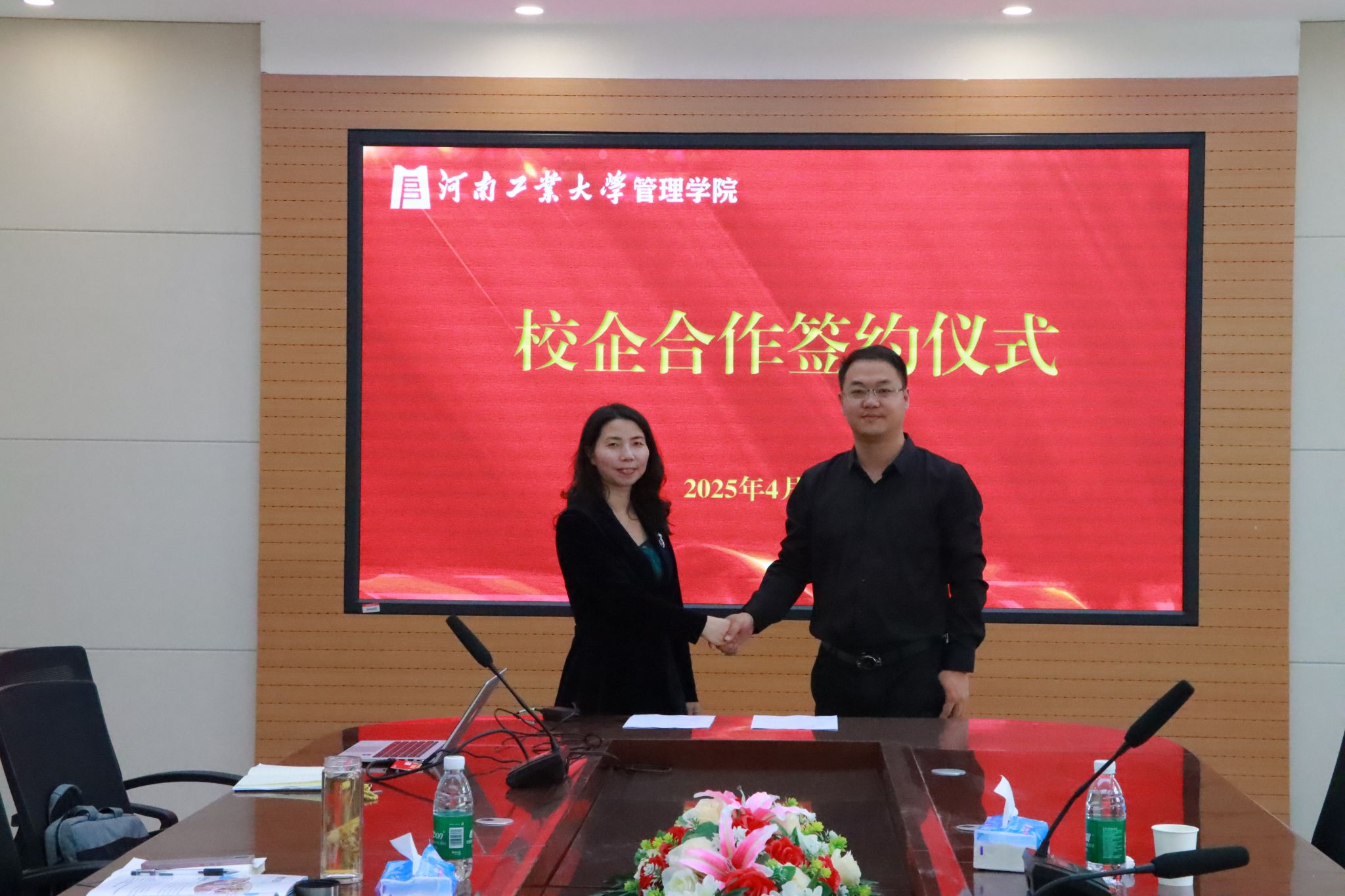 党委副书记曹启娥与河南增长力企服集团副总经理祁怀顺代表双方签署了校企合作协议书并合影留念。