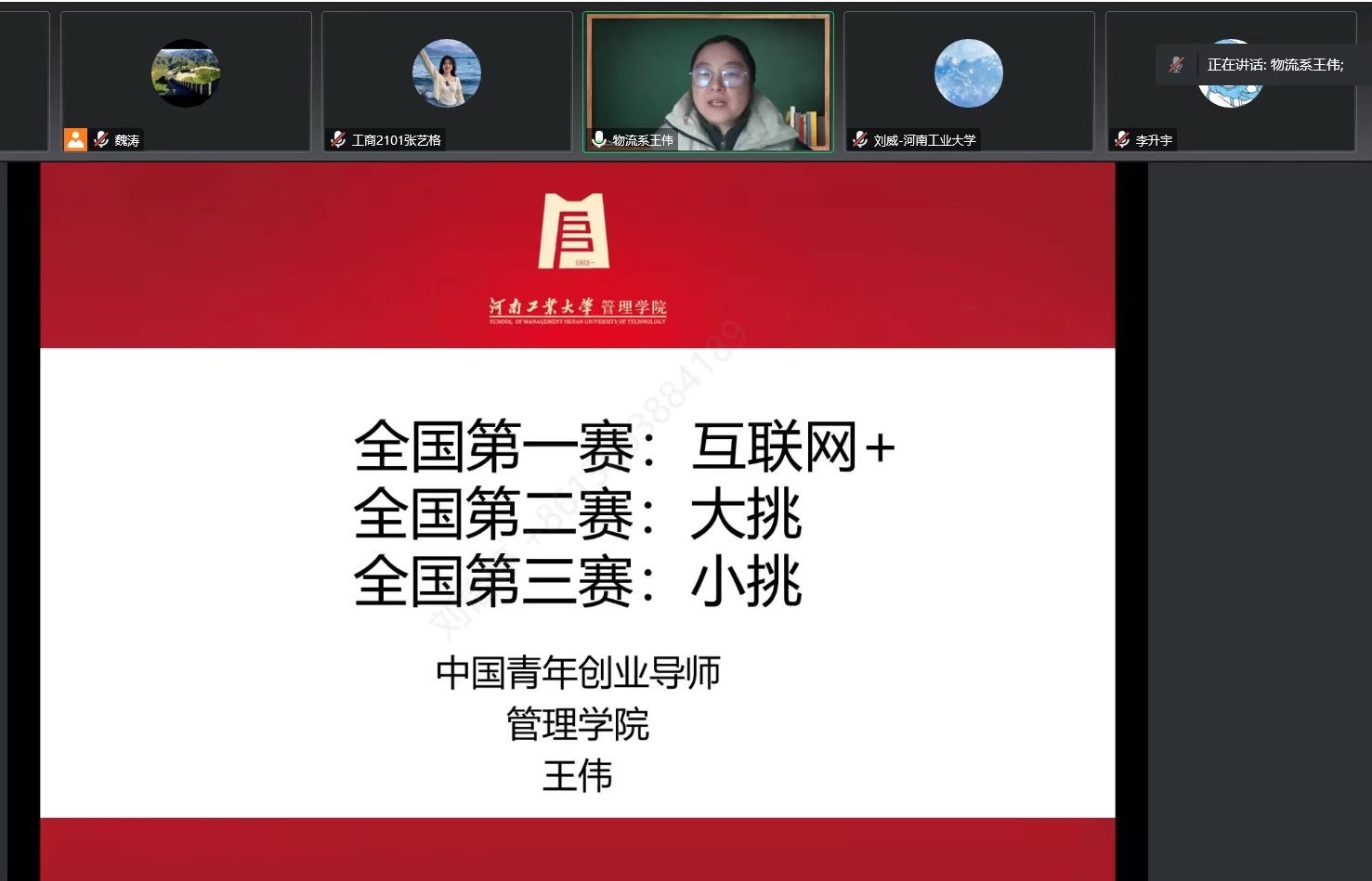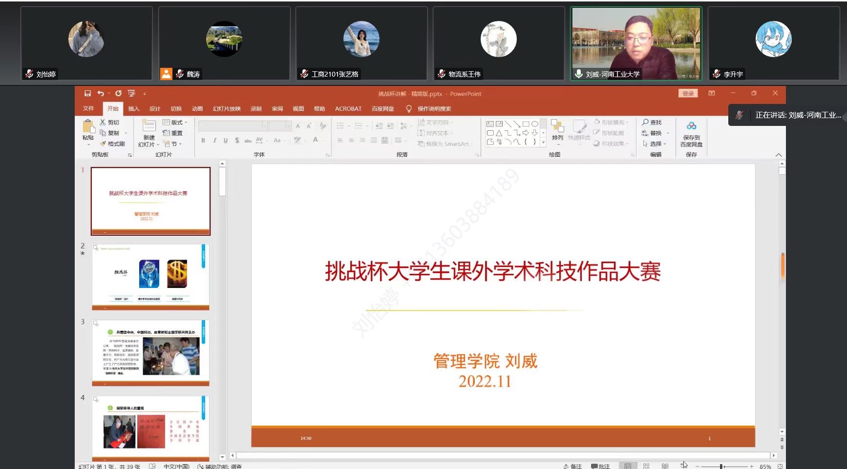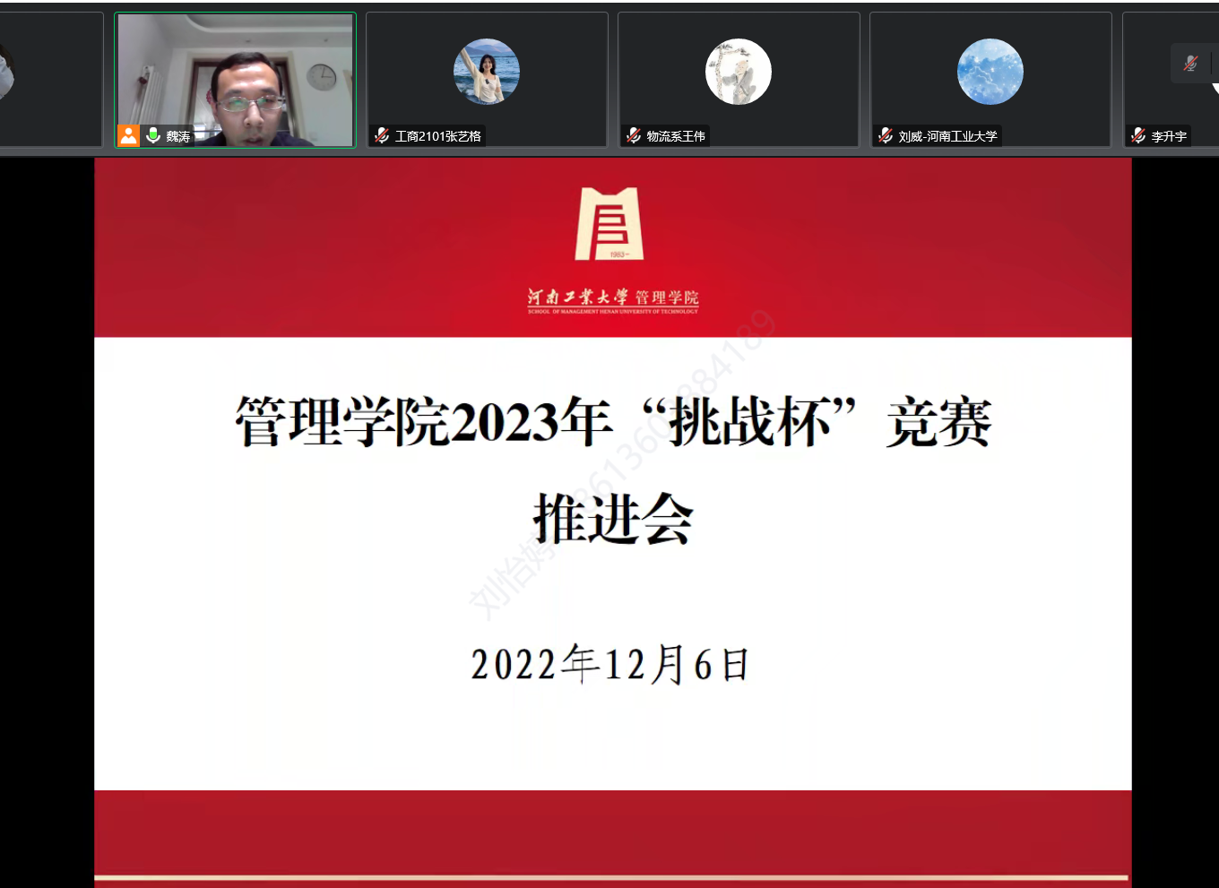 通过腾讯会议线上召开2023年“挑战杯”课外学术科技作品竞赛推进会,中国青年创业导师王伟、挑战杯国奖优秀指导教师刘威作专题辅导,学院党委副书记魏涛、各项目指导教师以及团队学生参加了本次会议。