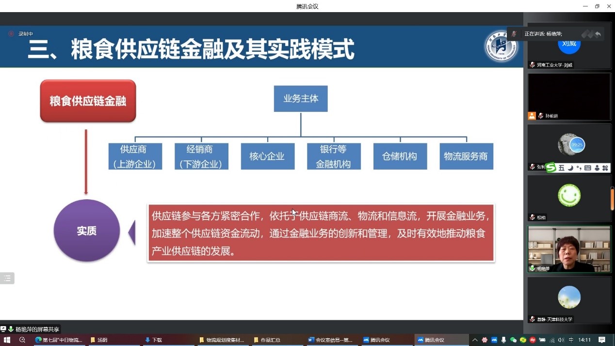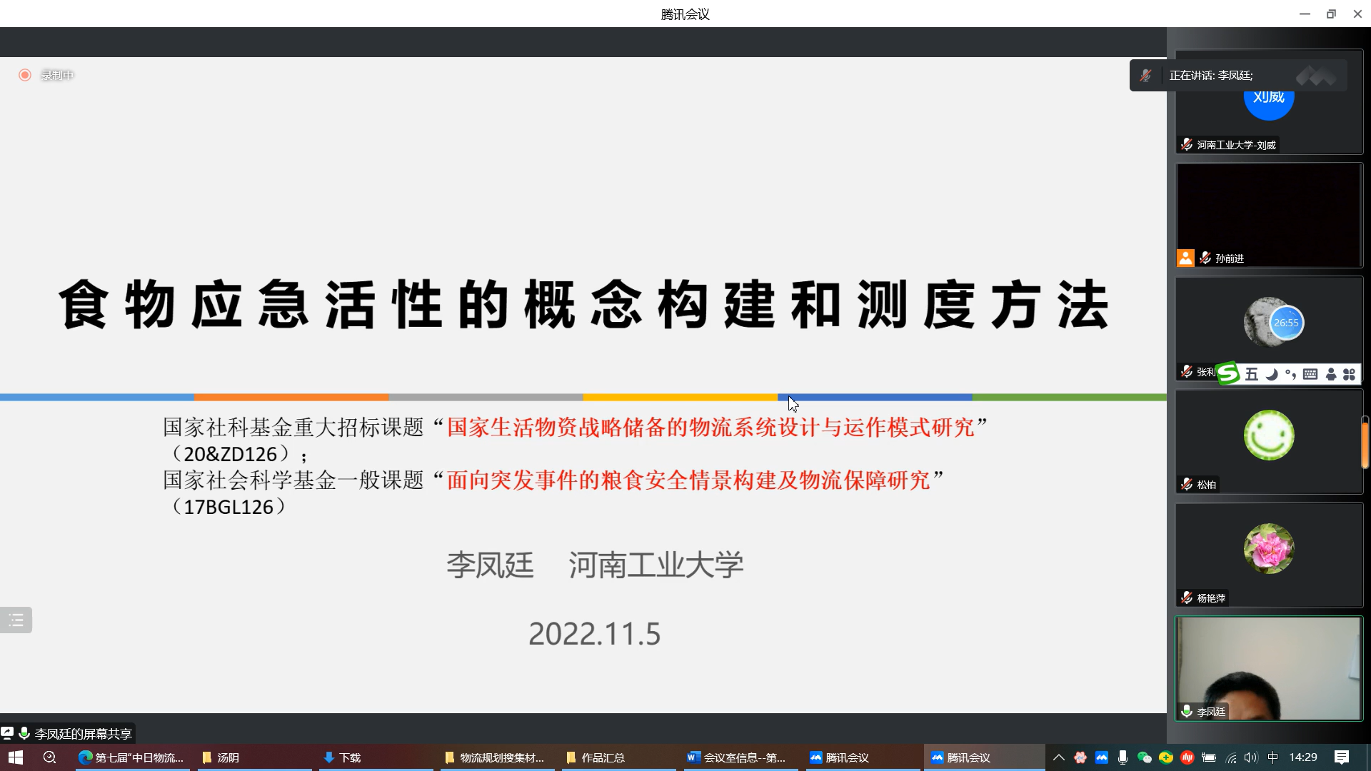 杨艳萍做了题为《粮食供应链金融风险与防控策略》的学术报告,分析了粮食供应链金融风险的主要类型,总结了供应链金融风险的形成原因,介绍了粮食企业实施供应链金融的具体模式,指出了粮食供应链金融风险的规避措施。李凤廷做了题为《食物应急活性的概念建构和测度方法》的学术报告,运用扎根理论和物理-事理-人理系统方法论,提出从营养活性、物流活性和食用活性三个维度建构食物应急活性概念,利用模糊物元分析方法对食物应急活性进行测度。