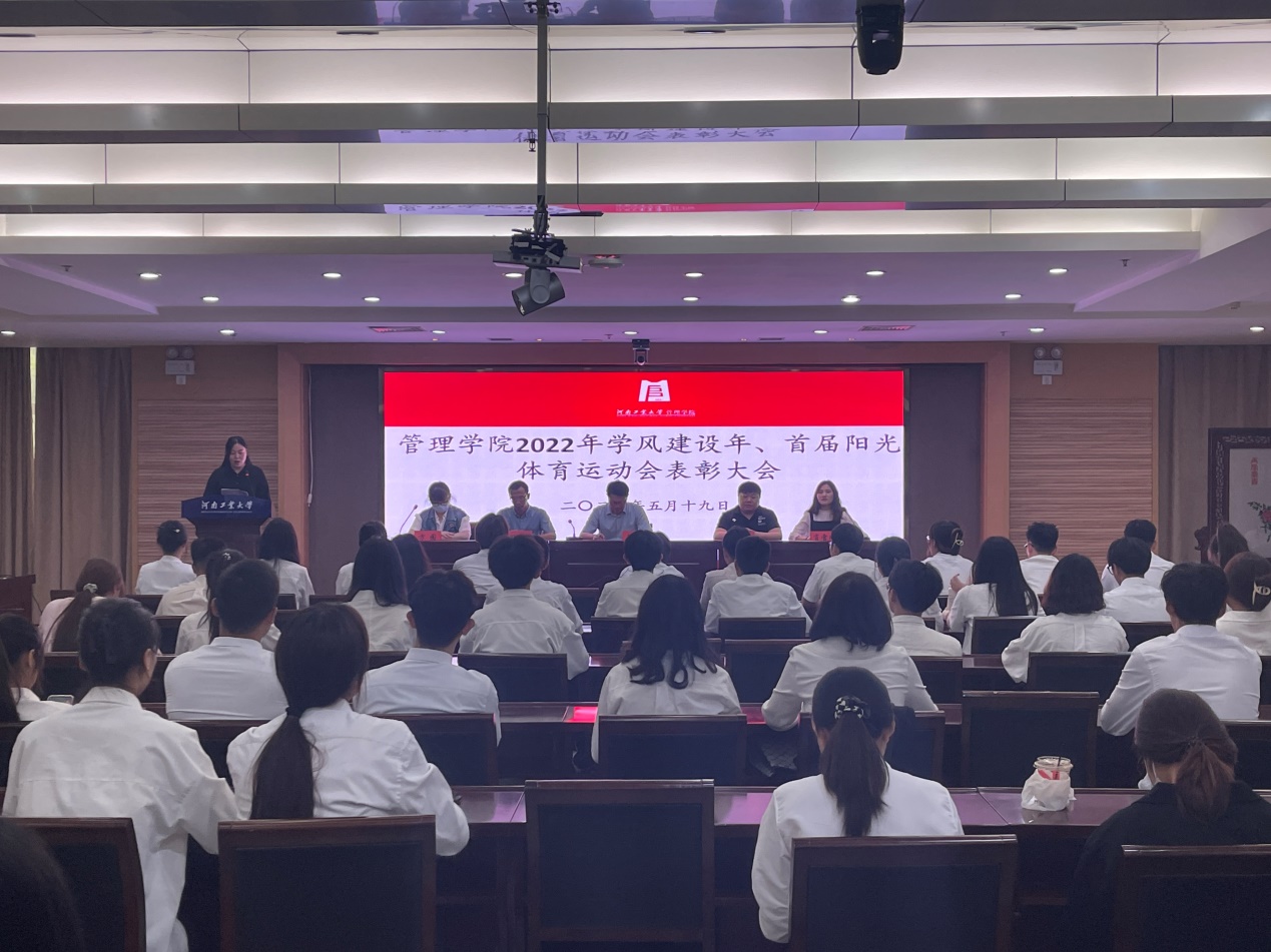 在学术报告中心D102报告厅举行2022年学风建设年、学校首届阳光体育运动会总结表彰大会。学院副院长韩江、院党委副书记魏涛、学工办主任王风云、全体辅导员、受表彰的学生代表及各年级学生代表参加会议。会议由王风云主持。