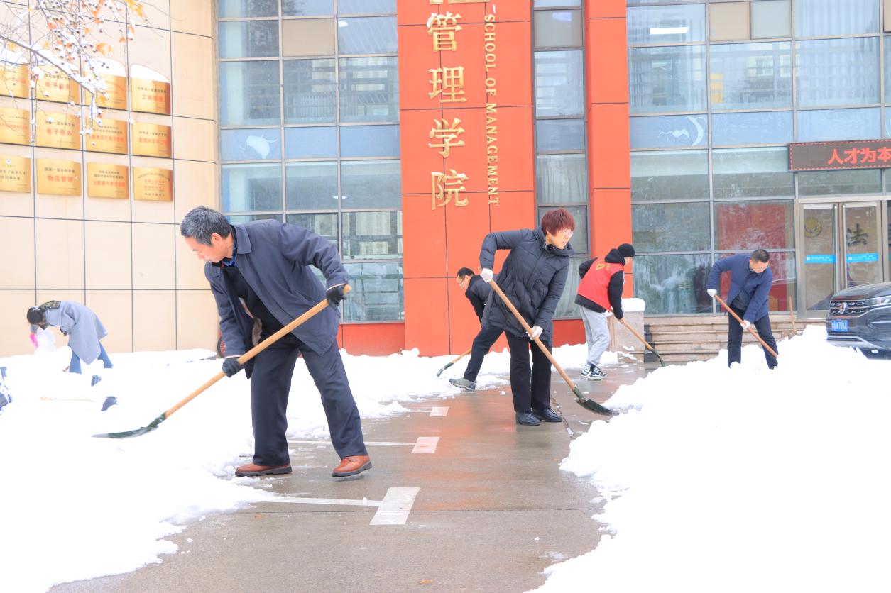 12月10日夜间,我市迎来岁末第一场暴风雪,厚厚的白雪覆盖了整个校园,给广大师生出行带来诸多不便。12月11日一早,我院积极响应学校《关于开展冰雪清扫工作的通知》,学院党委书记魏明侠、院长杨艳萍带领学院师生党员在3号楼及其周边道路开展清雪活动,保障师生安全出行。