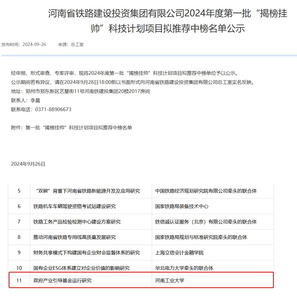 近日,河南省铁路建设投资集团有限公司公示了2024年度第一批“揭榜挂帅”科技计划项目拟推荐中榜名单,经过严格的申报、形式审查、专家评审和公开答辩等环节,我校研究生院院长、91暗网