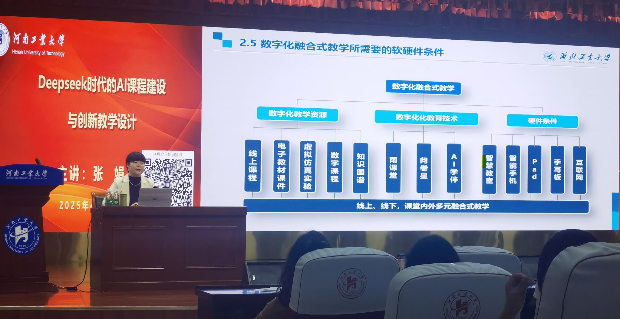 为深入贯彻国家教育数字化战略部署,探索人工智能技术与教育教学深度融合的创新路径,4月17日下午和4月18日上午,我院在学术报告中心D303、3220智慧教室分别举办了“deepseek时代的AI课程建设与创新教学设计及实践培训”和“教育数字化转型背景下5E融合式教学设计”的教学工作坊。活动特邀首批国家级线上一流课程负责人、全国高校教师教学创新大赛基础课程正高组一等奖获得者、西北工业大学张娟教授作专题报告和现场指导。工作坊由学院副院长韩江主持,学院30余名教师参加了本次活动。