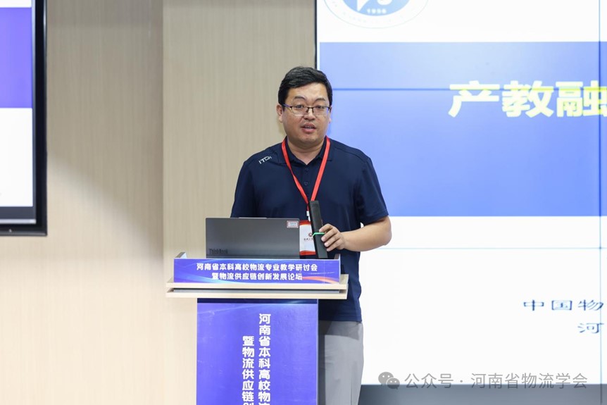 刘威副教授作《产教融合驱动物流与供应链专业转型升级》的主旨发言。他介绍了如何通过“三个课堂”联动机制,将企业的真实案例、技术导师和攻关课题深度融入教学全过程,并展示了与顺丰、郑州良运粮食口岸等企业共建教材、开发虚拟仿真实验课程、获得2门国家级一流课程、河南省教学成果特等奖等一系列扎实成果,为专业的“重塑升级”提供了可复制、可推广的成功范式。