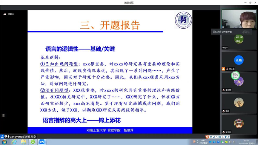 院长、MBA教育中心主任杨艳萍教授以《毕业论文写作系列讲座之写作规范》为主题,为学生深入讲解论文写作、选题方向,研究方法中遇到的问题及解决办法,并分享优秀硕士论文,让学生直观感受到论文写作的要点与逻辑,深受学生欢迎。