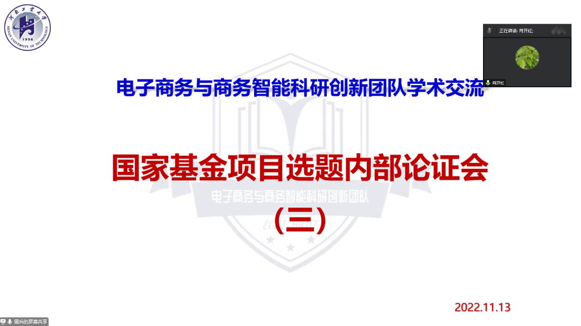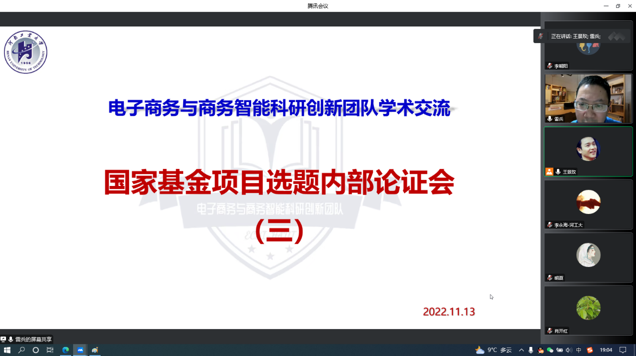 为持续推进团队2023年度国家基金申报工作,提升基金项目申报质量,11月13日,电子商务与商务智能科研创新团队在线上举行了国家基金项目选题第三次论证会,校社科处处长肖开红以及团队10名老师参加了此次会议。
