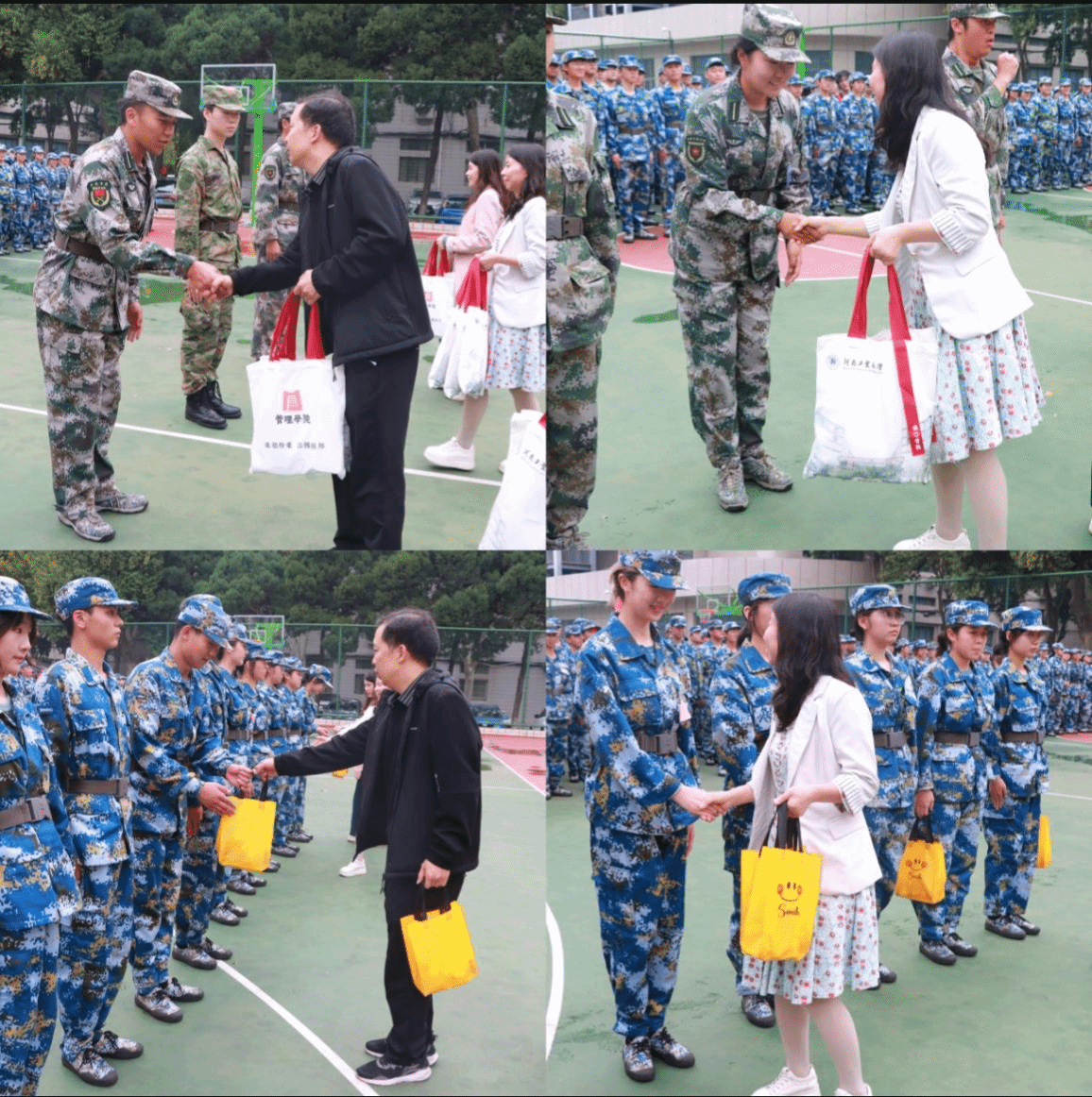 随后,李国仓、曹启娥向全体军训教官及新生代表送上精心准备的慰问品。