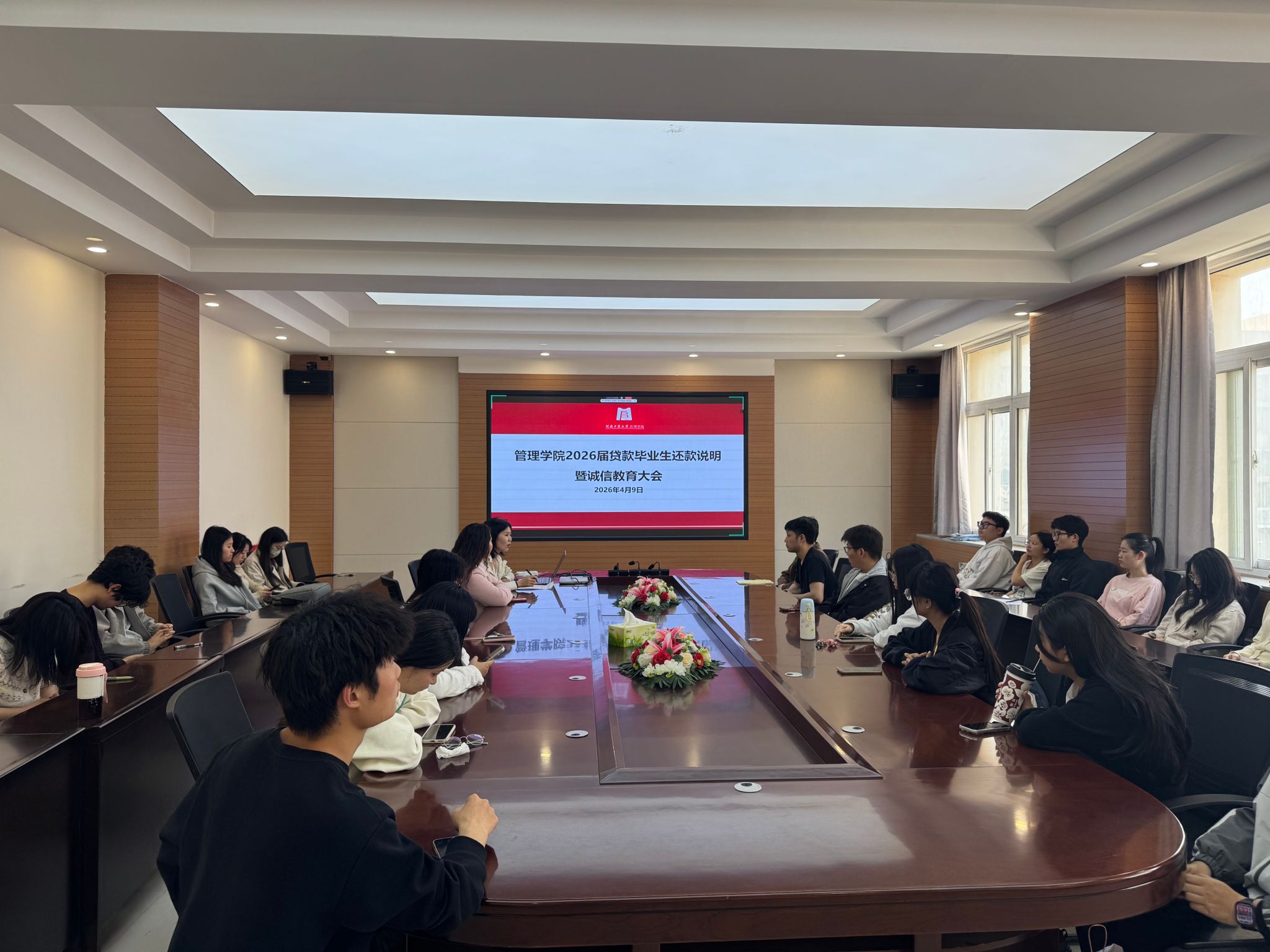 为进一步加强国家助学贷款贷后管理,防范违约风险,帮助毕业生熟悉还款流程,4月9日下午,91暗网 在博识楼3558会议室召开2026届贷款毕业生还款说明暨诚信教育大会。学院学工办主任王风云、资助负责老师冯梅、资助助理及2026届贷款毕业生参加本次会议。会议采用线上线下相结合的方式开展,由冯梅主持。