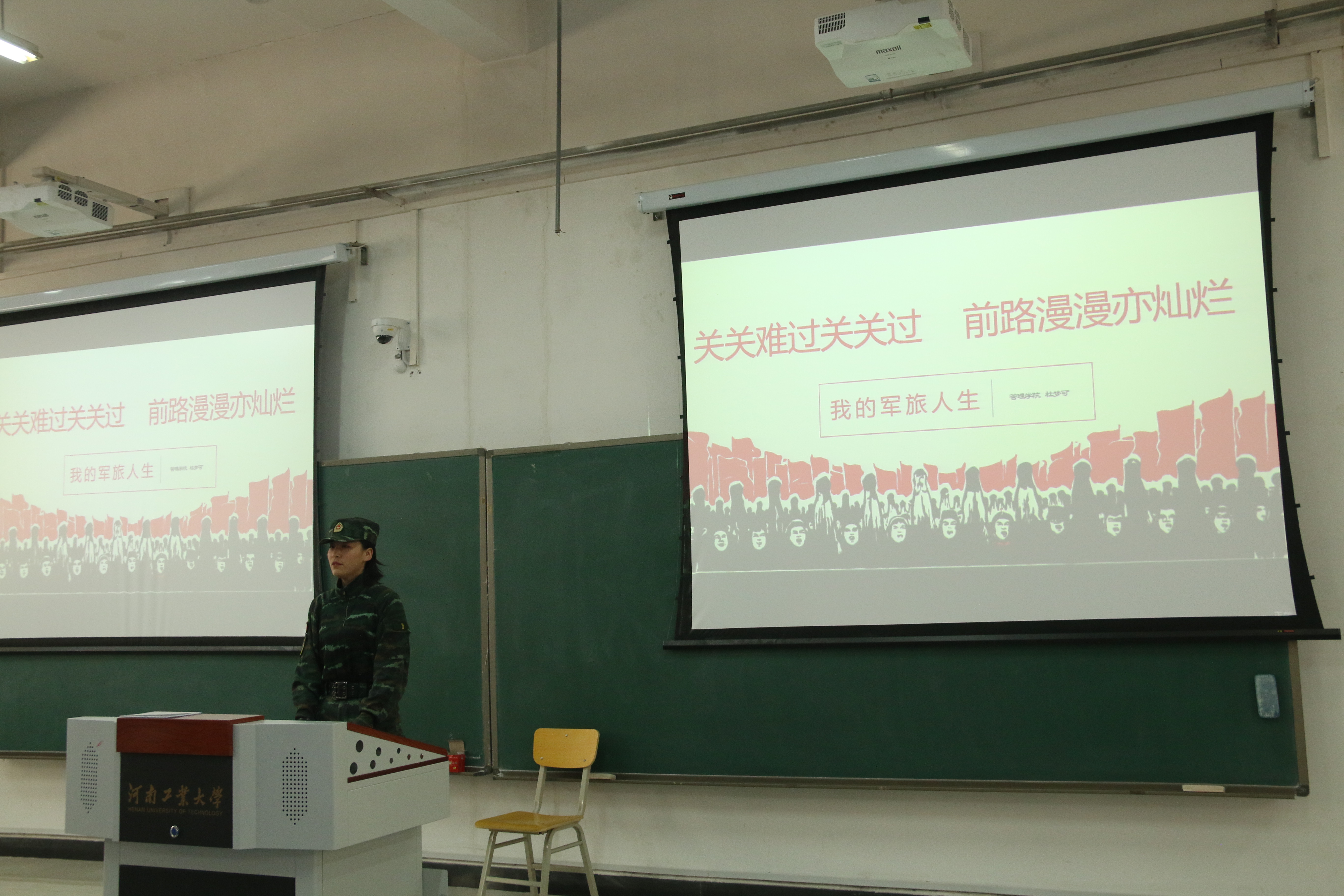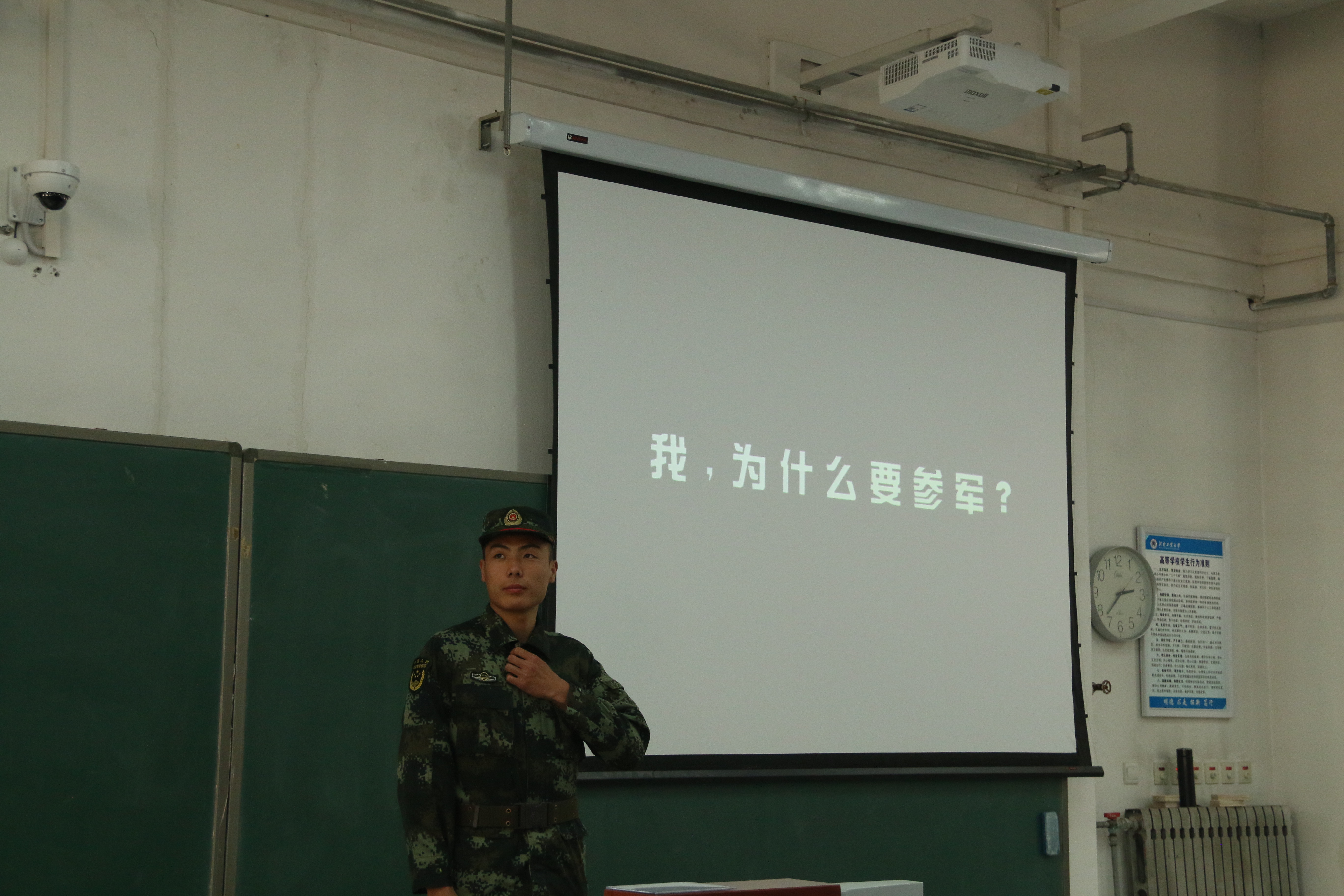 会议伊始,马天成从参军原因、军队生活、收获成就三方面介绍了自己在武警江西省总队吉安支队井冈山中队的军营生活及其获得的荣誉成就;杜梦可通过图片和视频分享了其在武警猎鹰突击队的军队生活,使在场师生深深感受到了军人的坚毅精神和英雄气魄;张汉豪介绍了自己曾服役的中国人民解放军65589部队的军队装备、军队训练和军队生活,展现出参军报国,无上光荣的精神;李强和任鹏伟分别从自身加入西部计划的初衷和过程、西部计划的相关政策、志愿者类型以及如何选择志愿服务地区等方面对西部计划作了详细的介绍,鼓励同学们积极入伍,为西部发展做贡献。