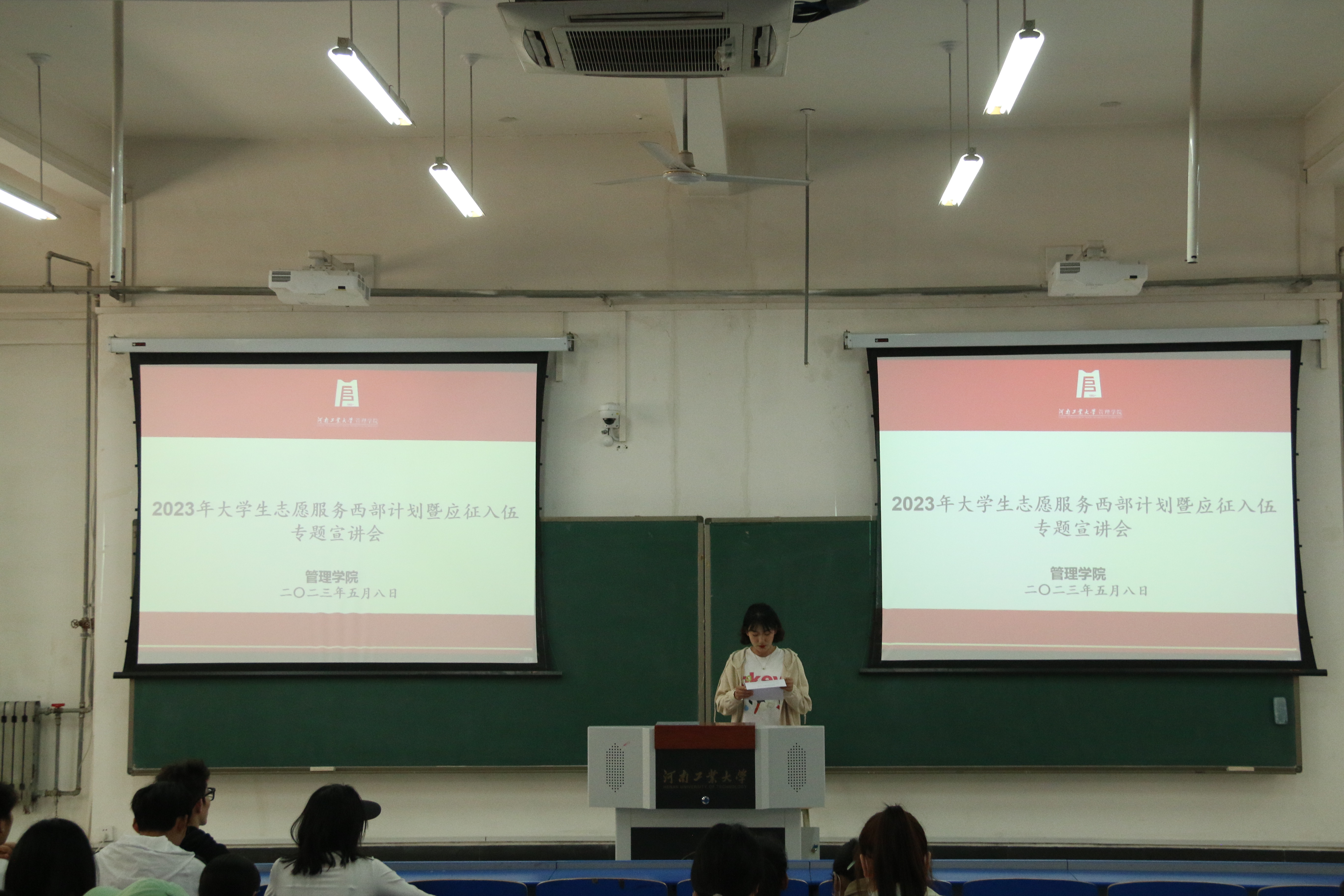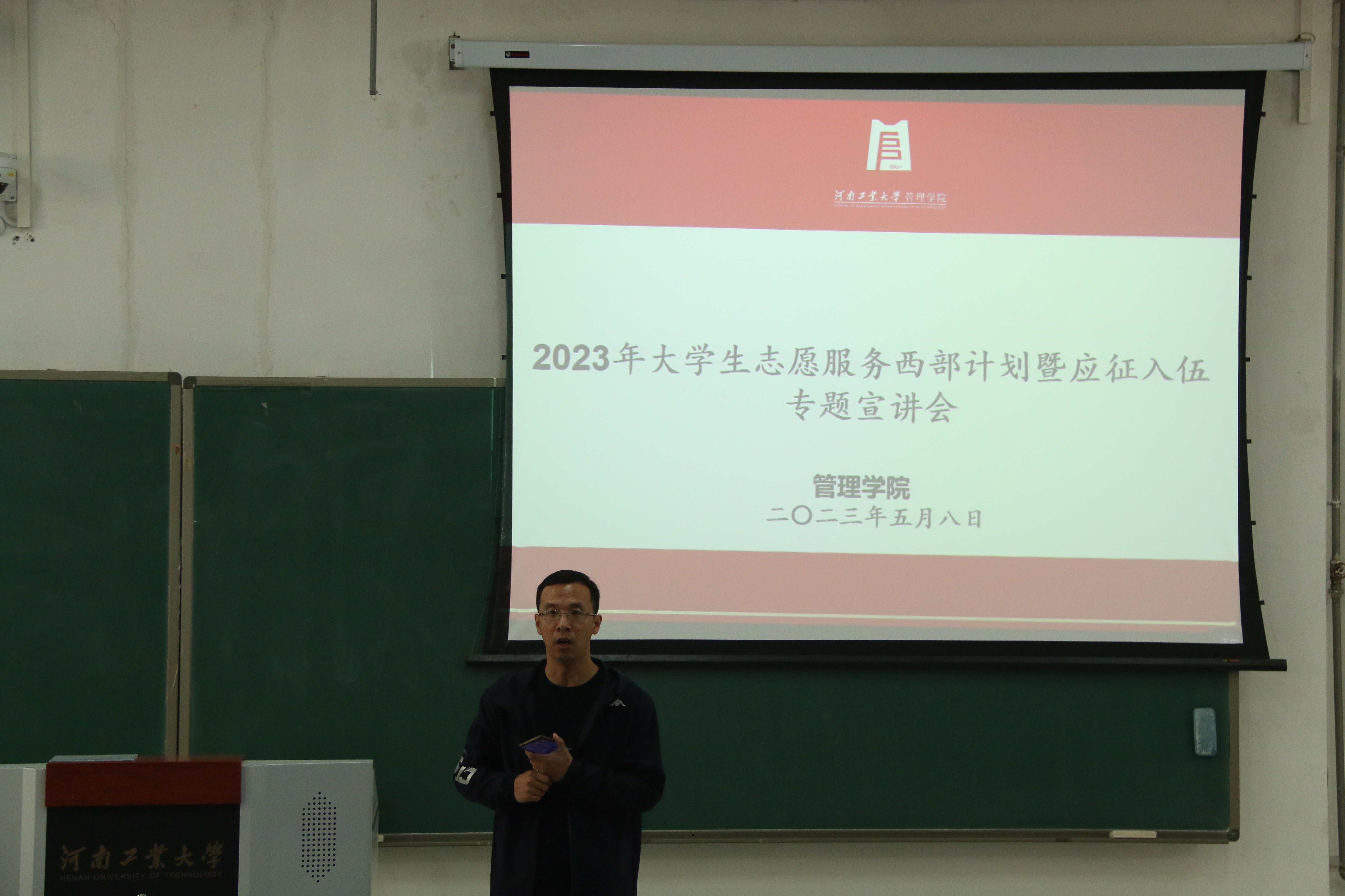 在3135教室举行2023年西部计划、应征入伍宣讲会。会议邀请了参与西部计划的志愿者李强、任鹏伟,优秀退役大学生代表马天成、杜梦可、张汉豪分享西部志愿感悟,学院党委副书记魏涛作动员讲话,19级全体毕业生参加了会议。