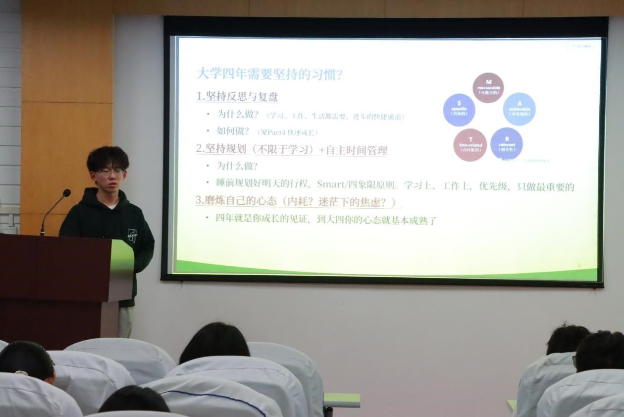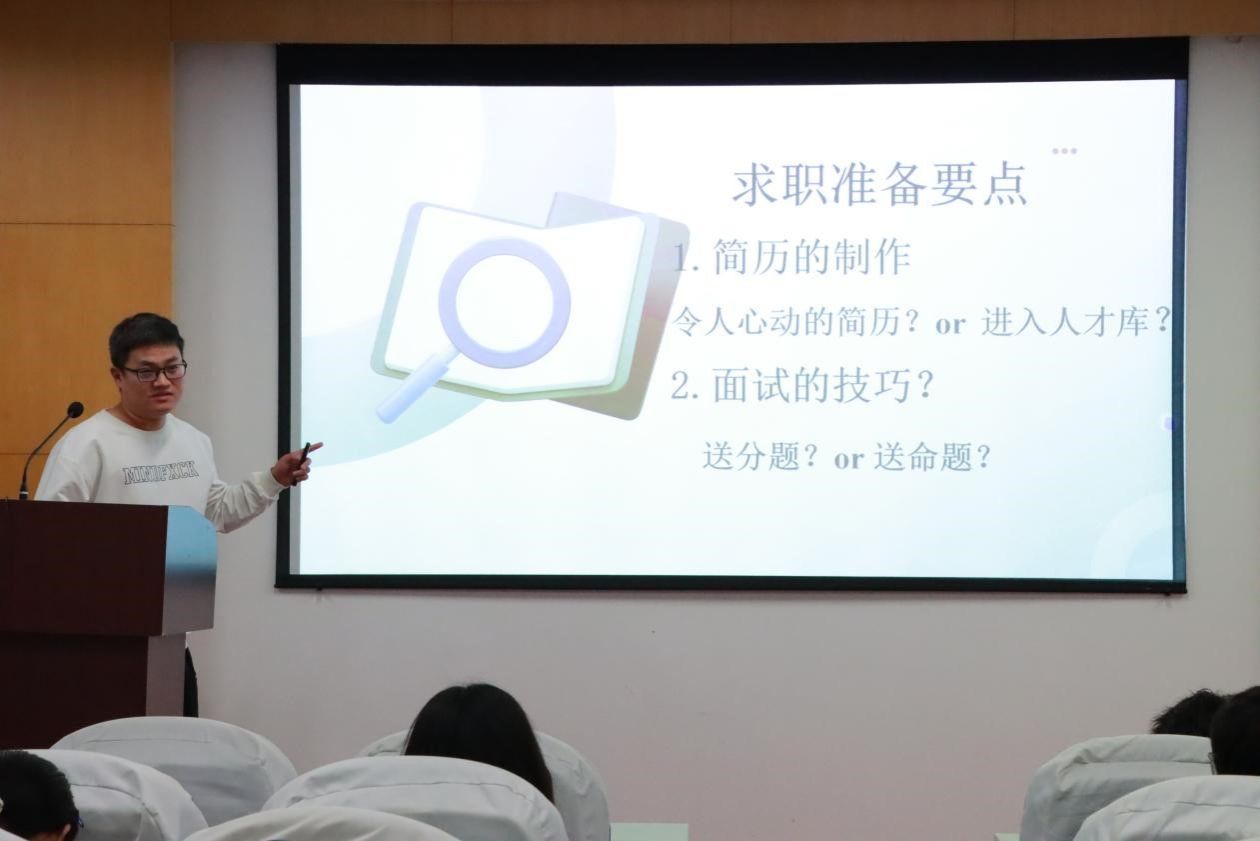 成功拿到牧原offer的物流管理专业2101班本科生臧勇强同学上台分享了他的求职经验。他详细讲解了简历制作和投递中的细节要点,并结合自身经历从自我介绍准备、问题导向准备和模拟面试训练三方面给予了同学们实用的建议,让大家对未来的就业充满了信心。