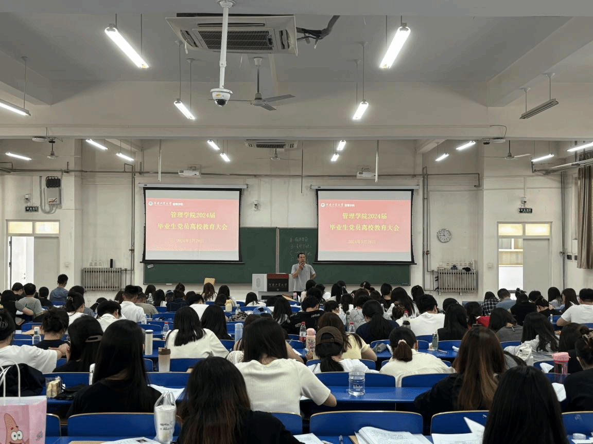 在3135教室召开2024届毕业生党员离校教育大会,学院党委副书记魏涛、党务工作中心助理及2024届全体毕业生党员参加会议,会议由团委副书记郑媛媛主持。