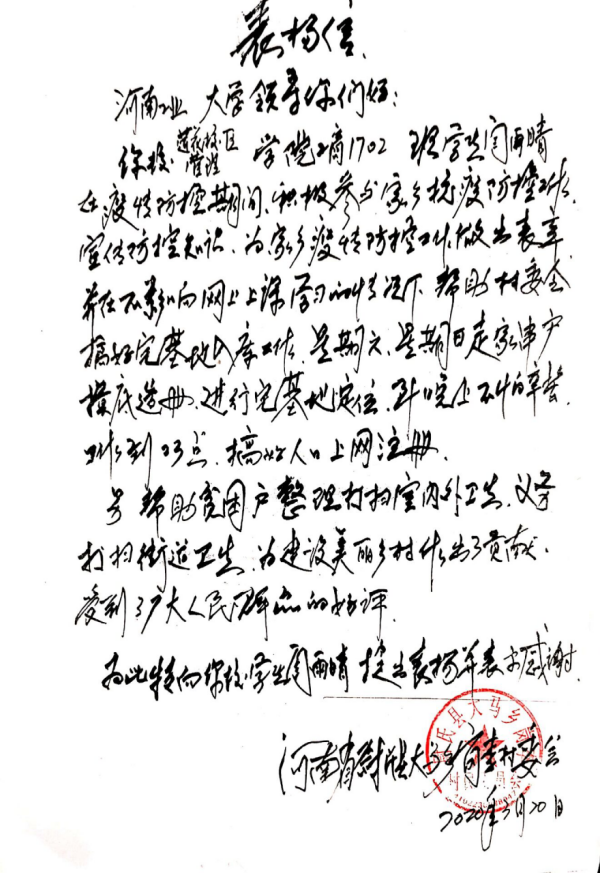 近日,我院收到来自河南省尉氏县大马乡岗李村村委会发来的表扬信。信中对我院工商管理专业1702班闫雨晴同学能够积极主动加入到疫情防控工作表达了感谢。在2020年新冠疫情发生期间,闫同学积极响应国家号召,深入防疫抗疫一线,投身疫情防控青年突击队,积极宣传防疫相关知识。在不影响正常网上学习情况下,帮助村委会做好基地入库工作,走家串户摸底造册,进行基地定位,网上人口注册等工作,帮助当地贫困户整理打扫室内卫生,义务打扫街道卫生。闫雨晴同学在防疫工作中尽职尽责、真诚热心、踏实肯干、服务贴心,得到了工作人员和群众的一致好评,充分展示了当代大学生的责任与担当,诠释了新时代大学生的家国情怀,彰显了青春的蓬勃力量。