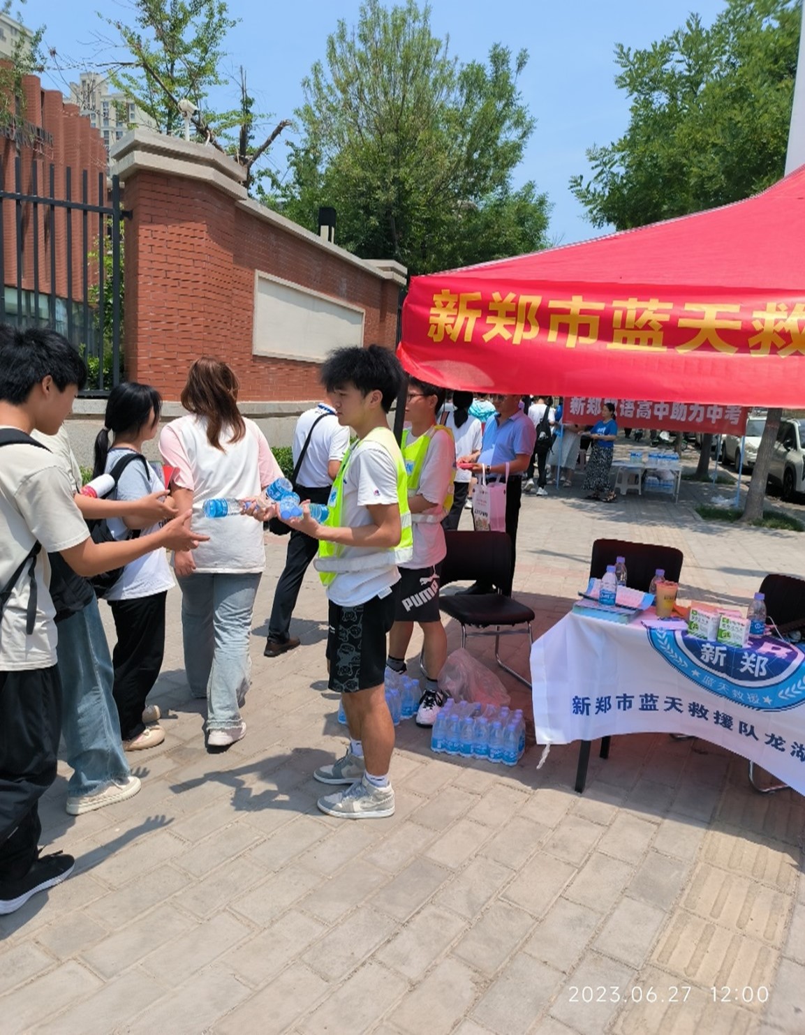 早上六点,组内成员收拾好东西前往目标地点龙子湖第一初级中学和郑州外国语学校正商智慧城这两所初中。在这里,我们看到朝气蓬勃的学生们,带着自信满满的笑颜进入考场。首先,我们将蓝天救援队带来的矿泉水水按照要求摆放,将帐篷搭建好,开始了我们一天的工作。蓝天救援是全国31个省市自治区成立品牌授权的救援队,全国登记在册的志愿者超过50000余名,其中超过10000名的志愿者经过专业救援培训与认证,可随时待命应对各种紧急救援。蓝天救援是以志愿服务为原则、以建立和推动国内民间救援体系的发展,使每个国民享有免费紧急救援服务为宗旨,以专业化、国际化救援机构建设为目标。我们这次正是跟随这支队伍进行防溺水宣传活动,为中考考生们在考试结束后送上一瓶爱心矿泉水。