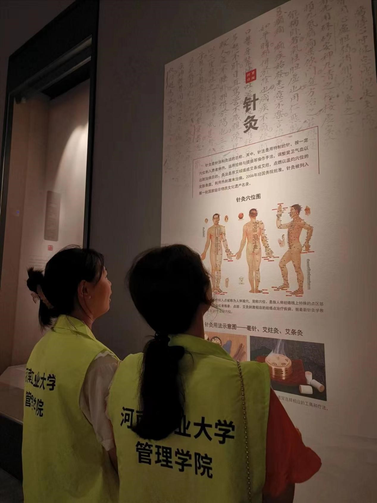 三楼展厅里的中医文化令人记忆深刻。我国的中医文化历史悠久,贯串于国民的日常生活活动中。中医在全国范围广泛分布,为全世界多民族共用。中医源于先辈们的生产实践中,发现了一些解除病痛的药物,经过长期积累探索与总结,现已经形成一套比较完备的、独具特色的治疗体系。各种各样的治疗方式体现着中华民族特有的思维方式。作为新时代青年,我们有必要为中医药学的传承注入新的活力。看着眼前众多的药材,我们感慨着古人的智慧,我们祈祷着这一份非遗文化永兴不衰。