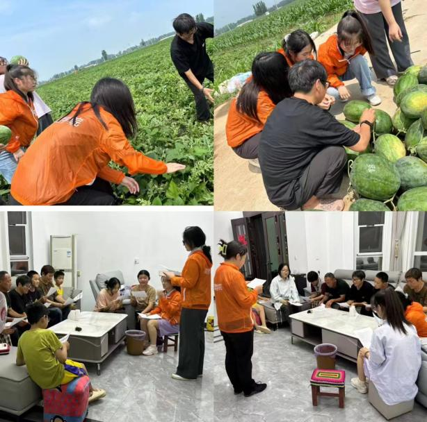 团队第一站便来到了庄稼地,不幸运的是遇到了恶劣天气,暴雨不停,但村支书梁本旺先生和团队成员并未因恶劣天气而暂停活动,依旧积极参与实践活动。梁支书非常配合团队工作,积极寻找当地农民为大家讲解西瓜的播种、生长、成熟以及采摘的知识和如何辨认甜不甜,熟不熟的方法。团队成员不仅学习到了农业知识,用亲身体验,拉近了与村民们的关系。