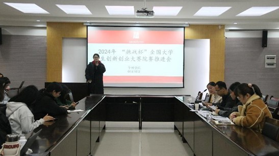 在3543会议室召开“挑战杯”大学生创业计划竞赛推进会,中国青年创业导师王伟、学院党委副书记魏涛、团委副书记郑媛媛、21级辅导员方园以及各参赛团队全体成员参加了会议。