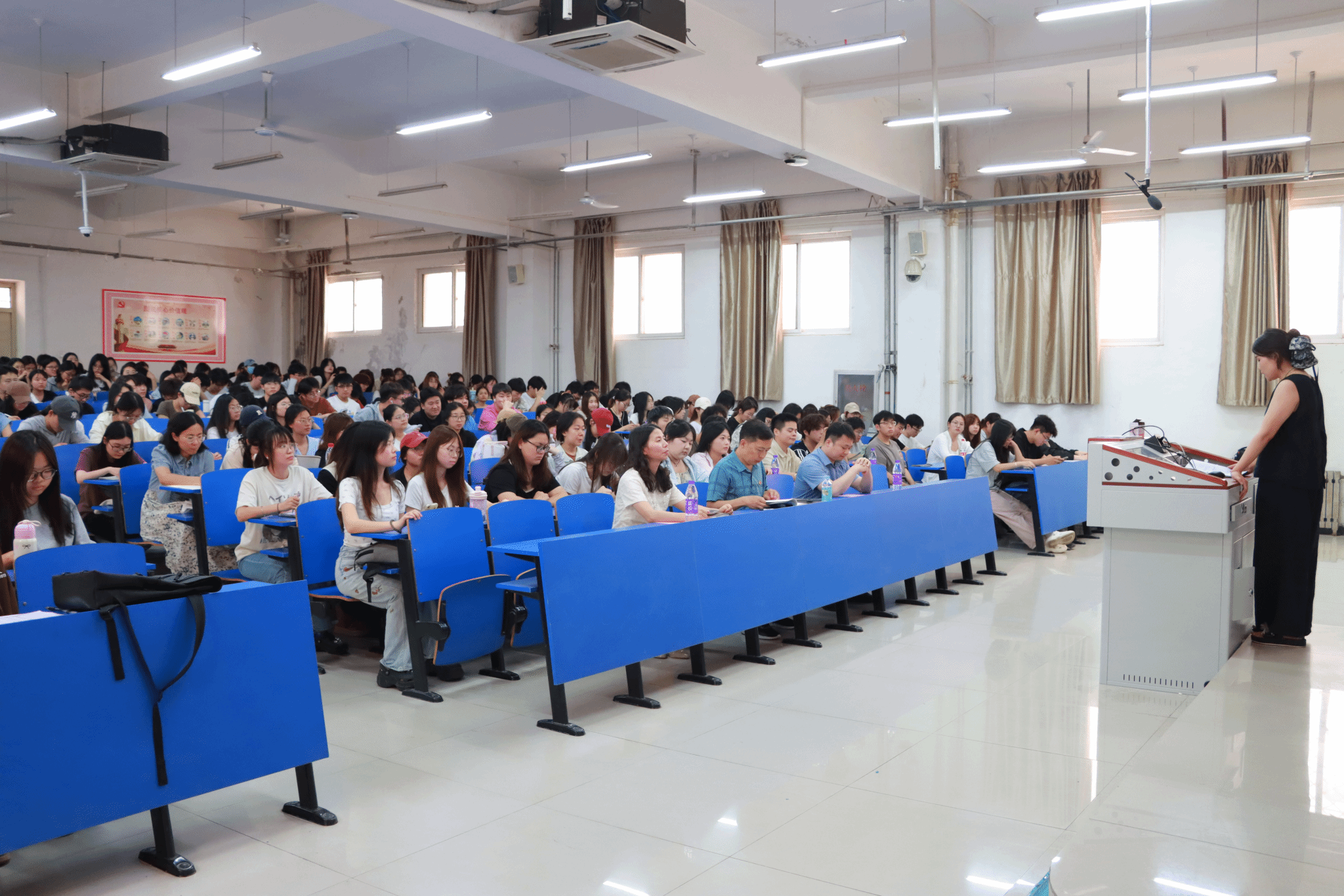 在经验分享环节,21级本科生祁林、范跃月,24级研究生滕仁杰依次上台,他们毫无保留地分享了自己在院校专业选择、备考资料收集、心态调整等方面的经验。祁林建议大家建立“冲刺-主攻-保底”三档院校梯度,为大家提供清晰的路径参考;范跃月重点分享了专业课的背诵技巧,强调通过“框架梳理+真题考点标记+行业热点结合”提升记忆效率;滕仁杰用亲身经历展现了跨考过程中“坚持”的核心意义,用“重复、计划、伙伴”三大关键词总结破局之道。现场同学认真聆听,不时用手机拍照记录要点。在互动问答中,同学们积极提问,学长学姐耐心解答,现场气氛热烈。