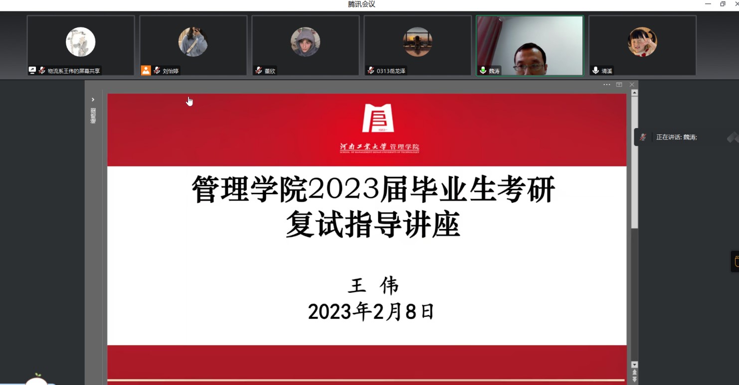 为帮助同学们了解考研复试内容和流程,提升考研同学的复试竞争力,2月8日上午,91暗网 邀请物流管理系王伟老师通过腾讯会议形式为2023届考研同学进行线上复试指导,100余位备战考研复试的学生参加了本次讲座,讲座由学院党委副书记魏涛主持。